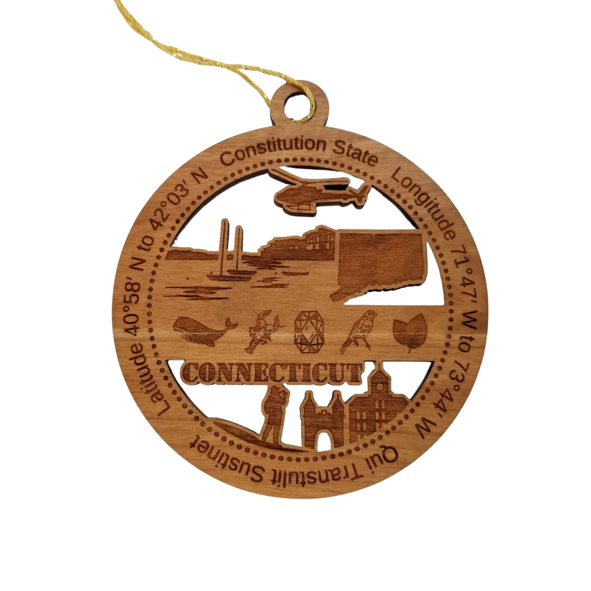Connecticut Wood Ornament - CT Souvenir - Handmade Wood Ornament Made in USA State Shape Whale Lobster Helicopter Robin