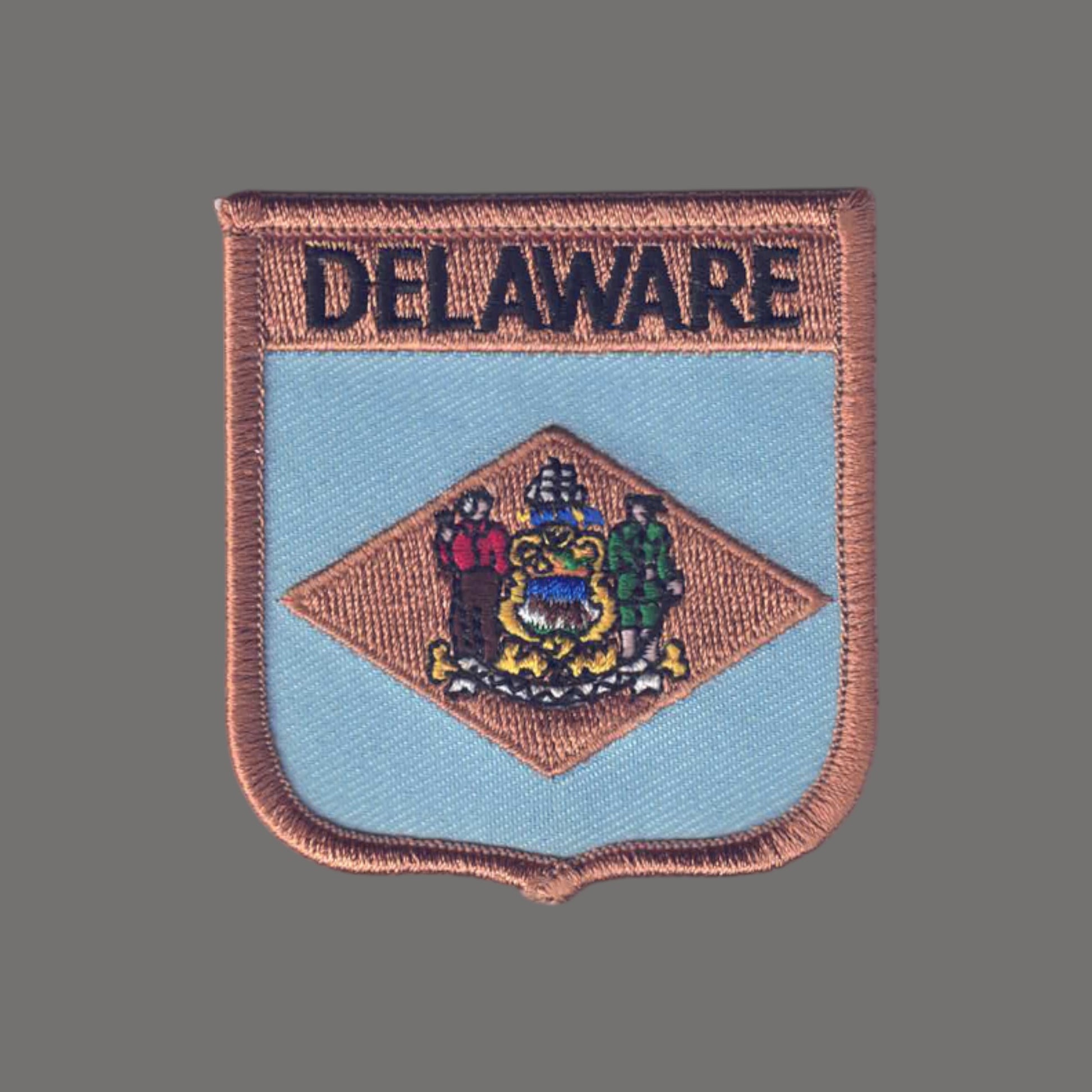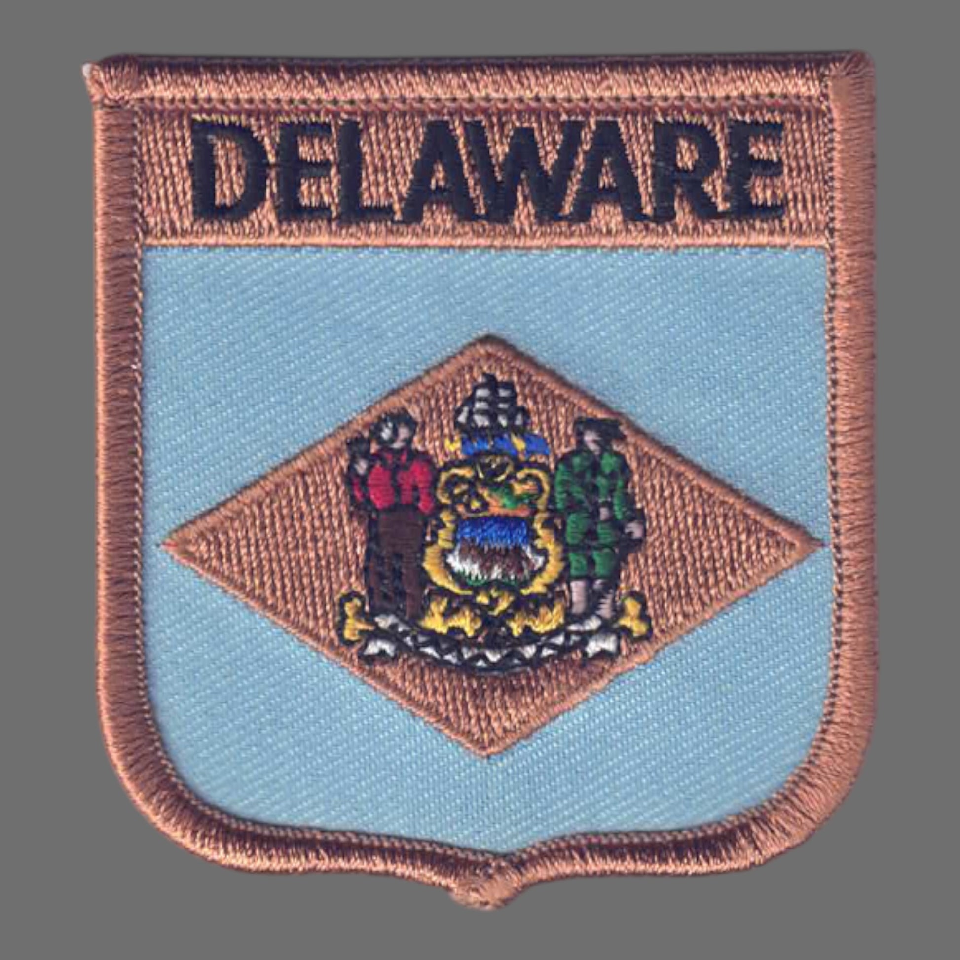 1355 - DELAWARE Medium Flag Shield Embroidered Iron On Uniform or Souvenir Patch, Badge, or Emblem.