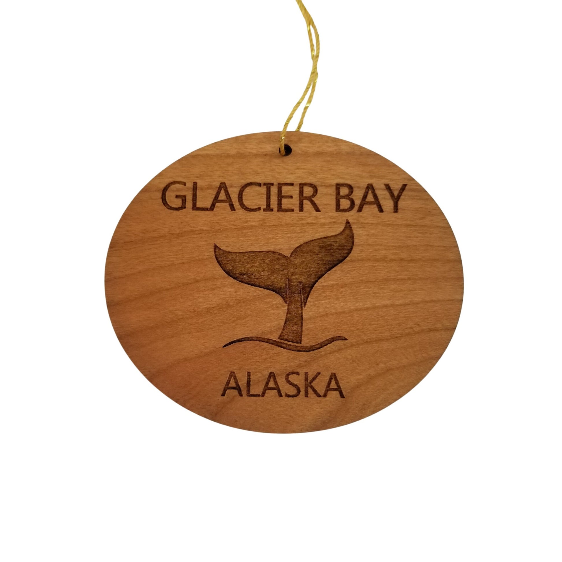 Glacier Bay Souvenir Ornament with a Whale Tail and engraved with a Glacier Bay Alaska namedrop. These wood laser cut handmade ornaments are made in our little father and daughter woodshop in northern California and make a great Glacier Bay memento or souvenir for anyone who has visited or is visiting Glacier Bay, AK.
