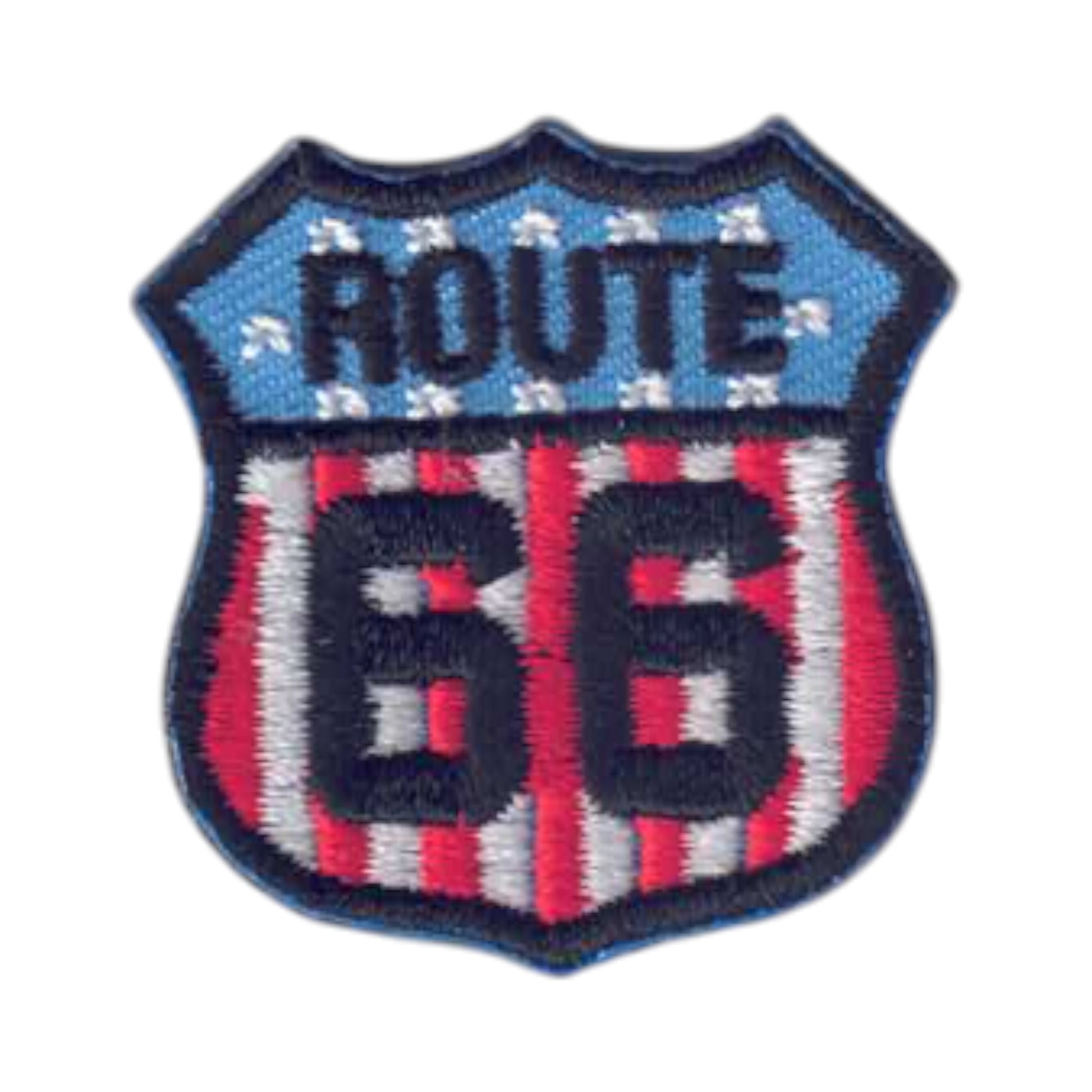 6892 - ROUTE 66 on US Flag Background MINI Souvenir Patch, Badge, or Emblem. Route 66 USA Red White Blue