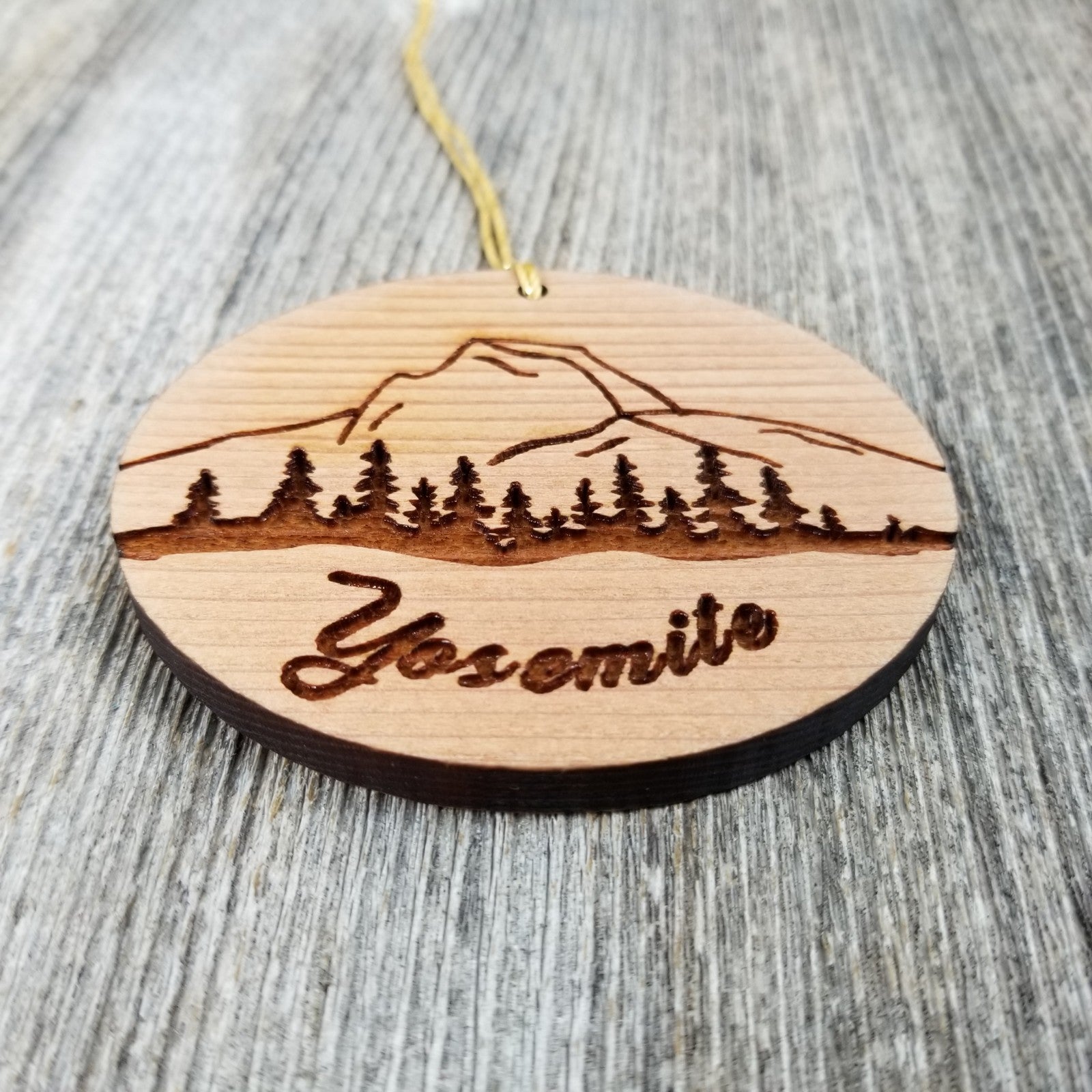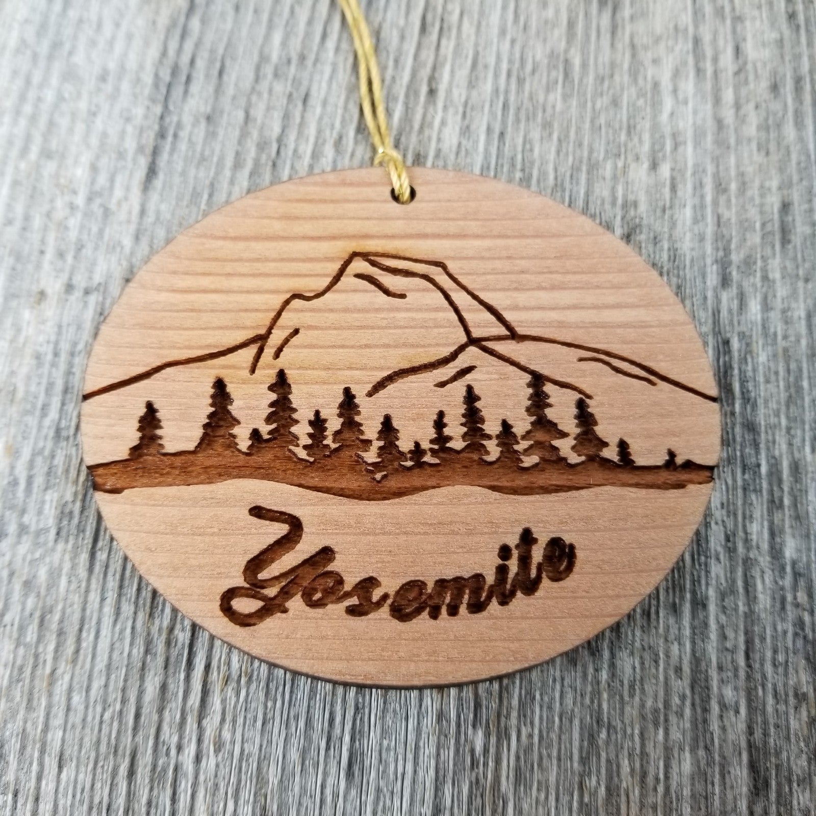 Yosemite National Park Wood Christmas Ornament depicting the famous Half Dome Rocks Mountains and Trees. Text says Yosemite.