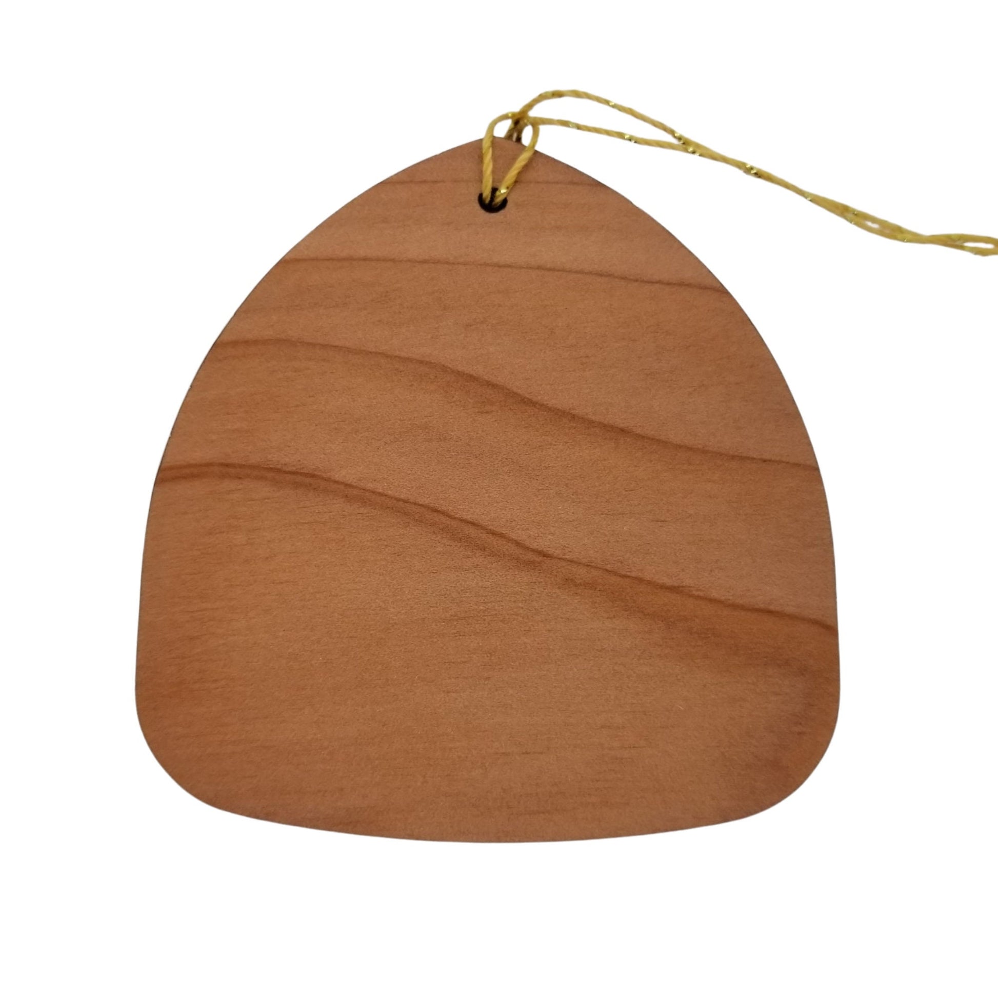 Each one is hand sanded and has a clear finish applied seal the wood and allow the color and grain to really come through. Each string is hand cut and hand tied. Photos are a general representation of the ornament you will receive. (Grain and coloring varies with each piece..)