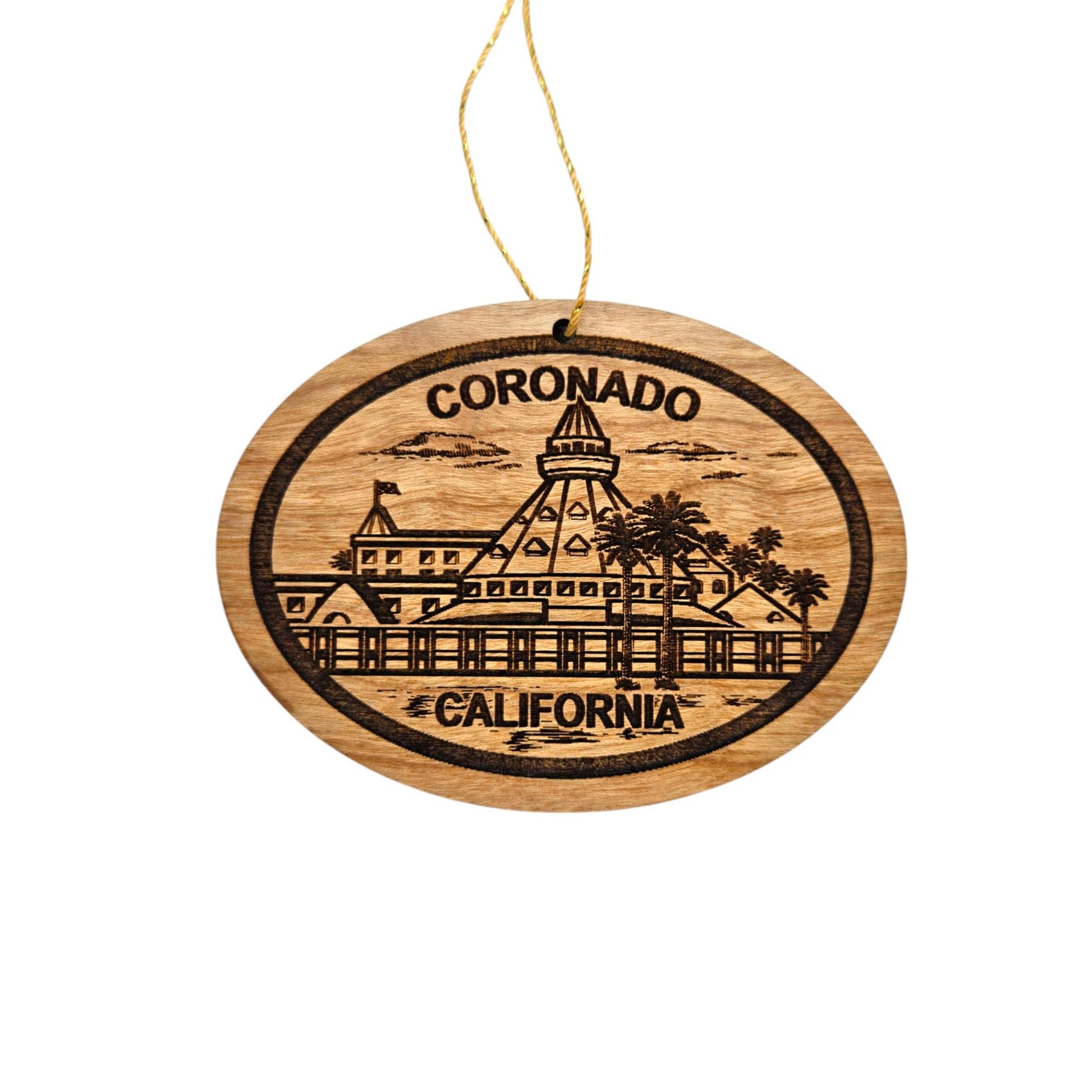 Coronado CA Souvenir Ornament with the Coronado hotel engraved with a Coronado California name drop. These wood laser cut handmade ornaments are made in our little father and daughter woodshop in northern California.