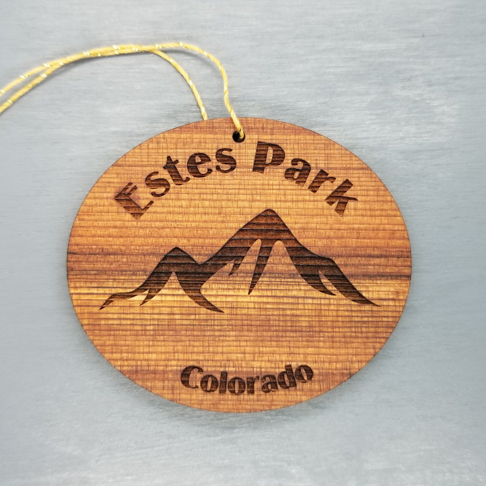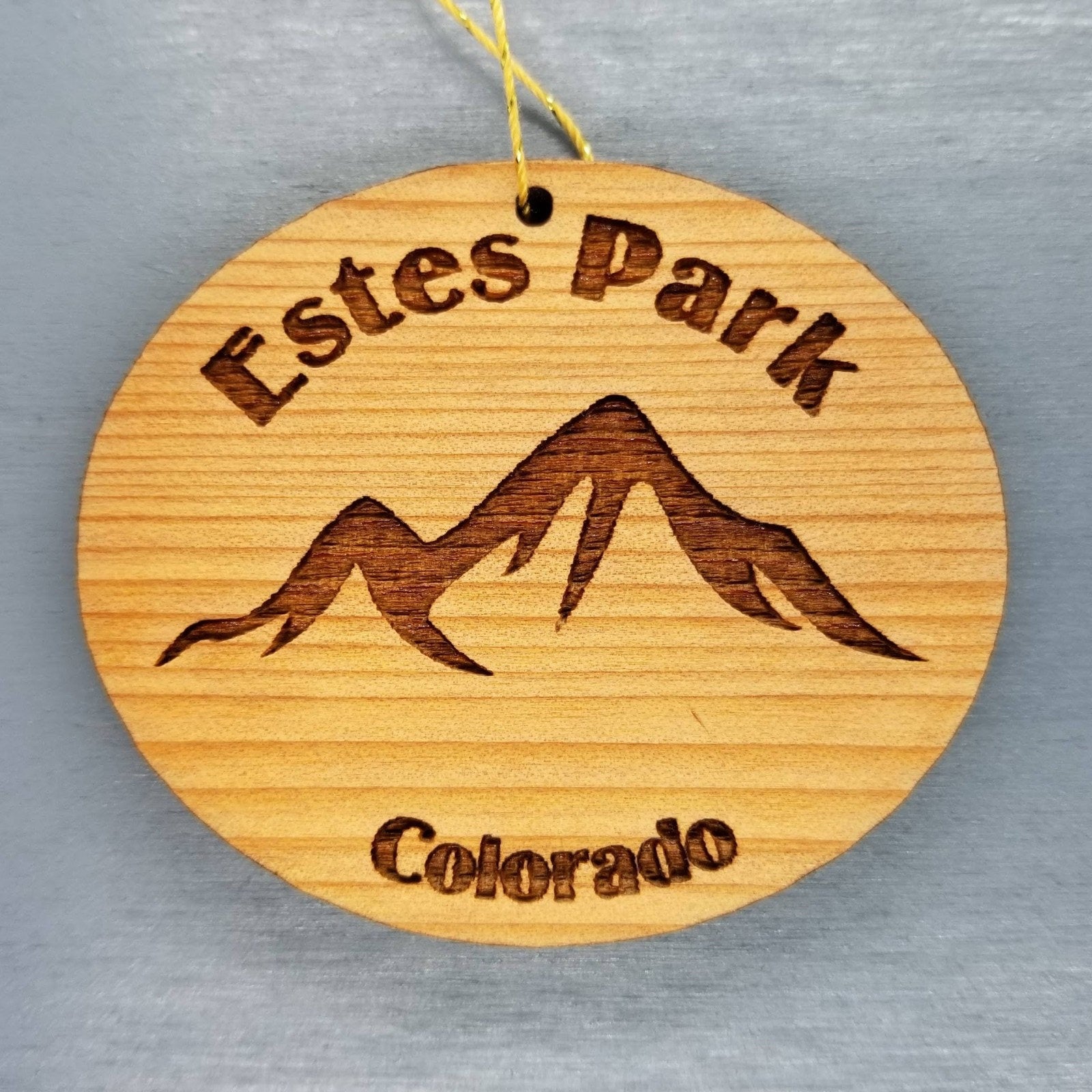 Estes Park Souvenir Ornament with Mountains and engraved with an Estes Park Colorado namedrop. These wood laser cut handmade ornaments are made in our little father and daughter woodshop in northern California and make a great Estes Park, CO souvenir or memento.