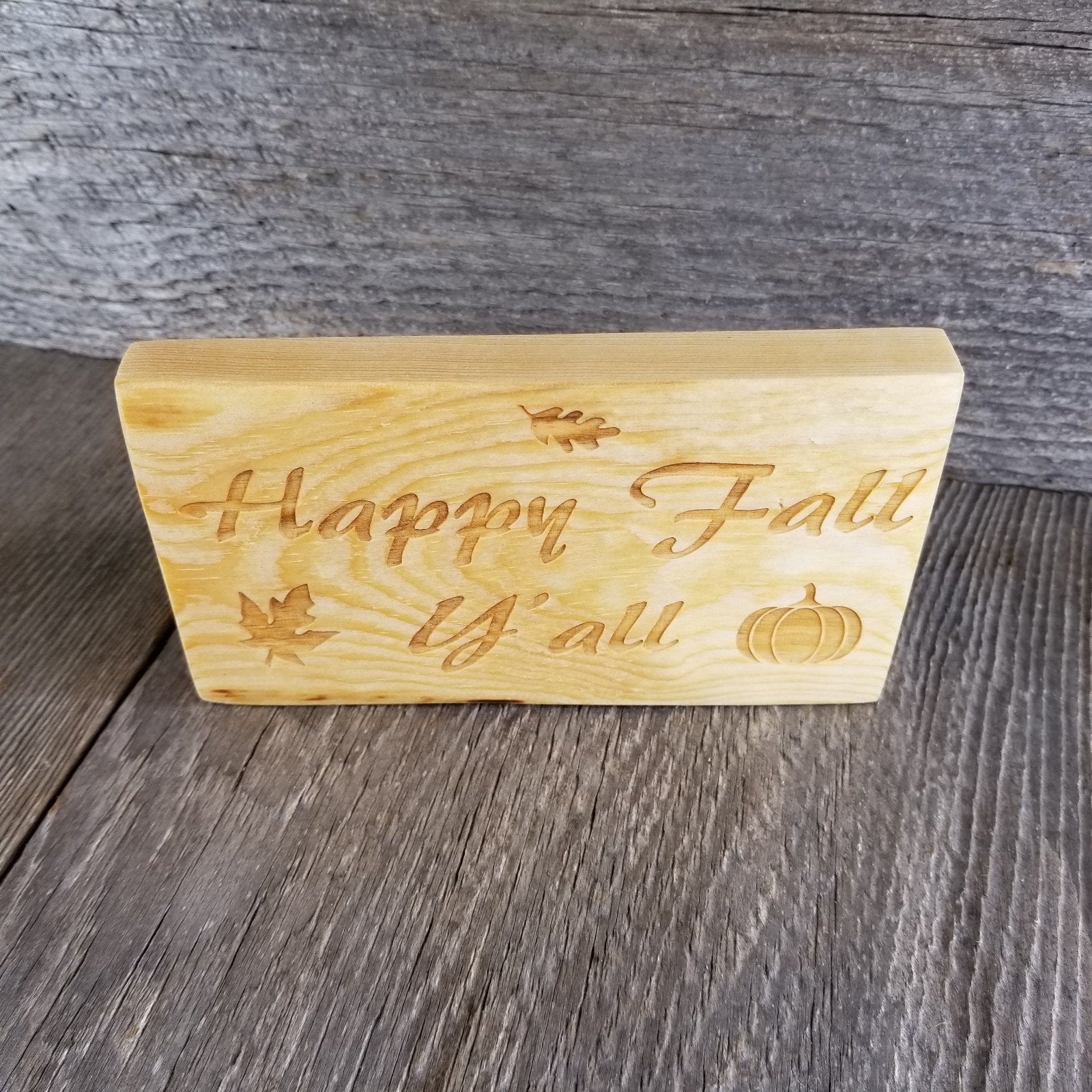 This cute rustic natural wood sign is the perfect fall sign for so many situations - friend gift, great for a gift exchange, or as a coworker gift, and for your own home decor. Whether in the house, office, or anywhere else you can think of these engraved wood signs will compliment any style. Text says - Happy Fall Y'all with a Pumpkin and leaves.