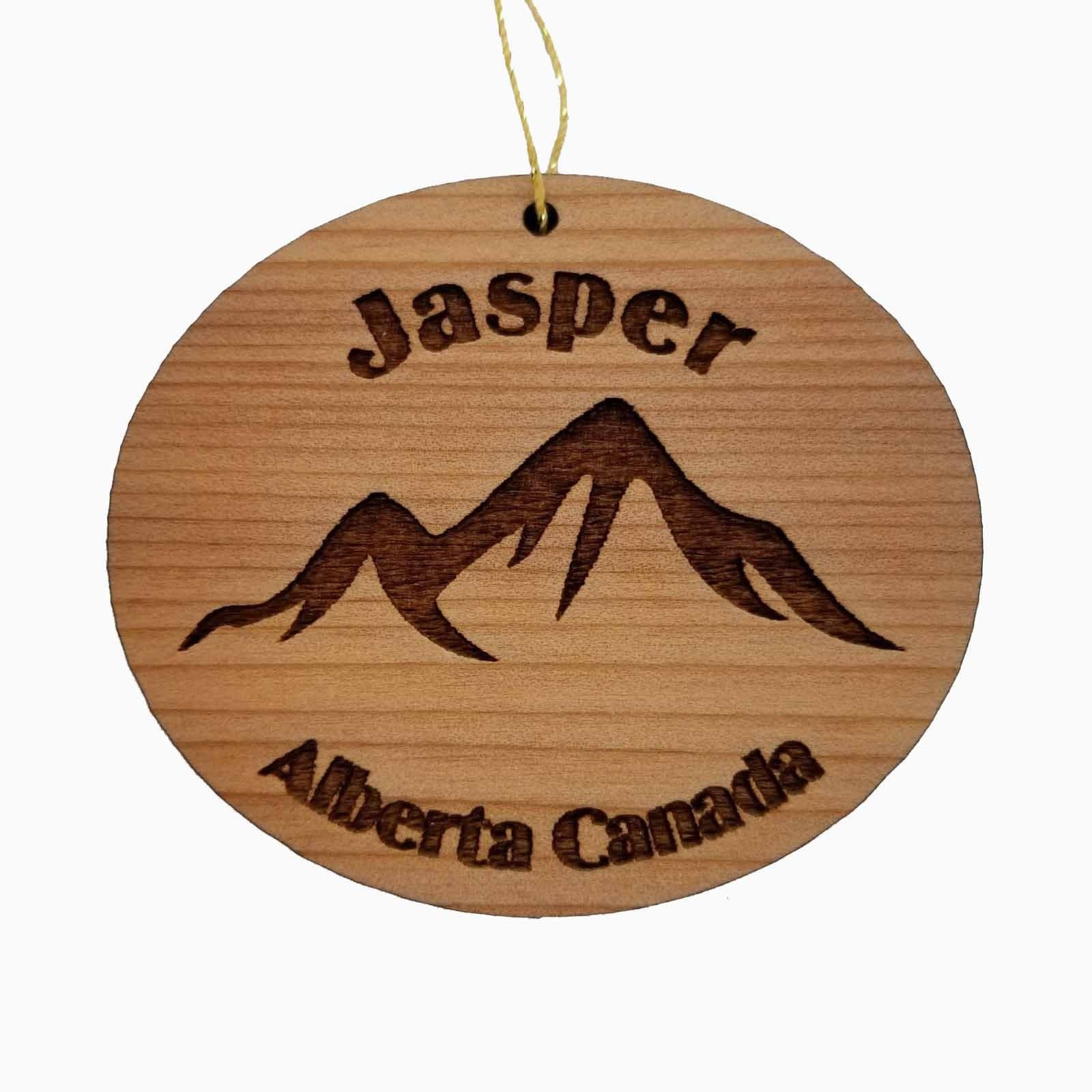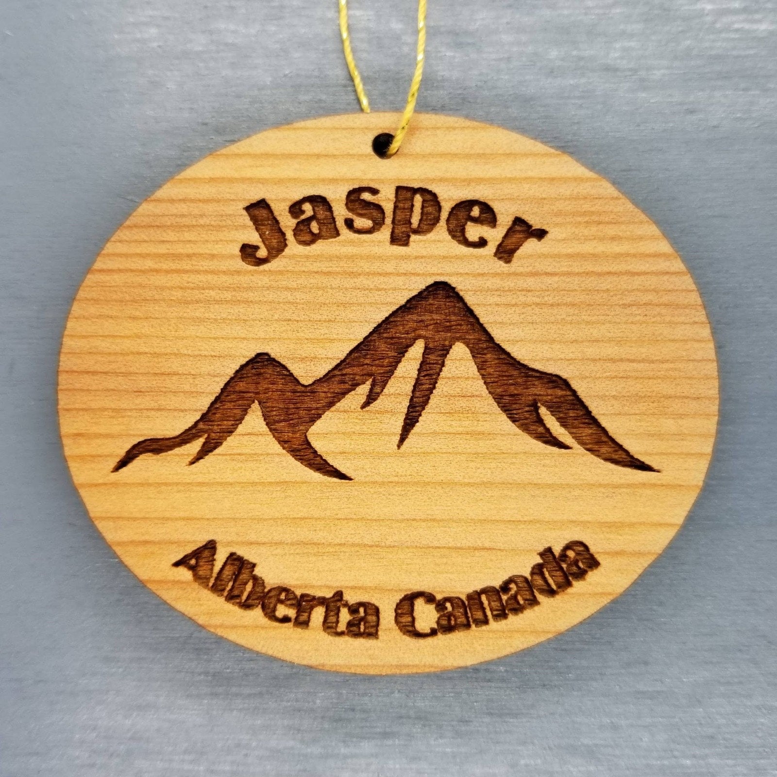 Jasper National Park Souvenir Ornament with Mountains and engraved with a Jasper Alberta Canada namedrop. These wood laser cut handmade ornaments are made in our little father and daughter woodshop in northern California and make a great Canada souvenir or memento.