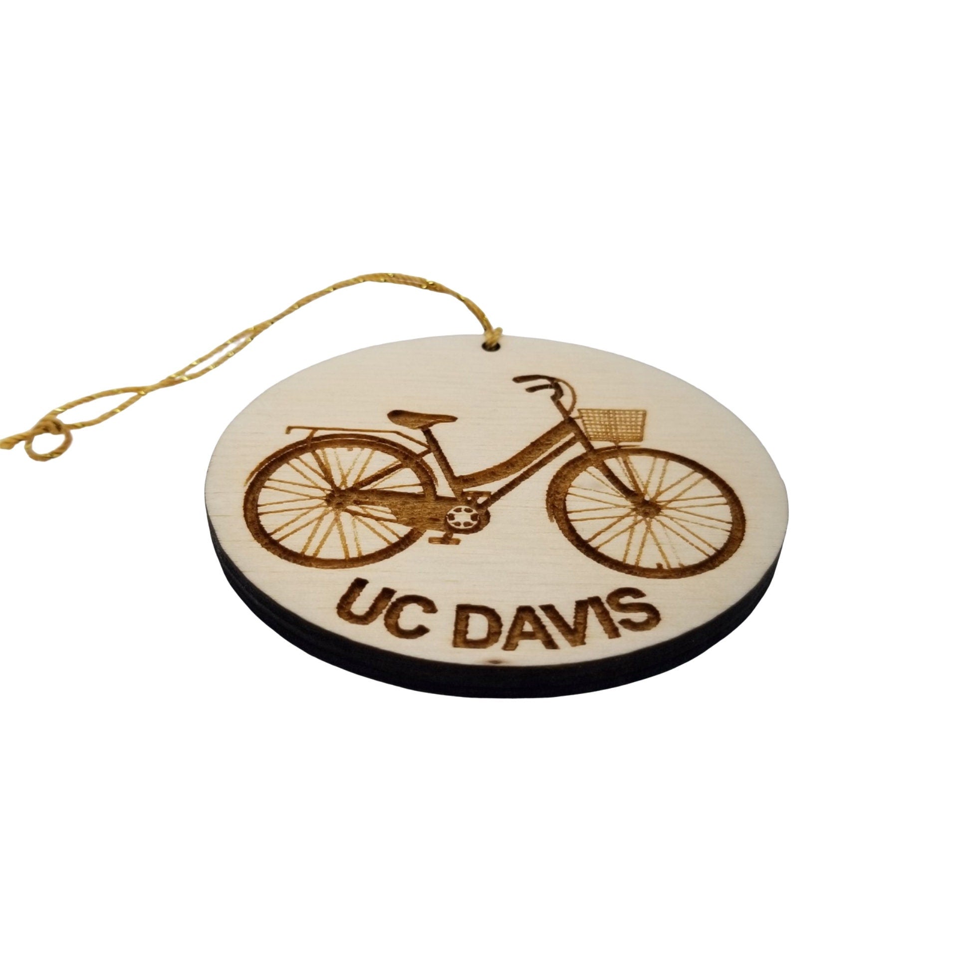 This Nantucket Ornament is handmade from wood in northern California. The engraved design depicts a women's bicycle with a front basket and back bike rack and says Nantucket at the bottom.