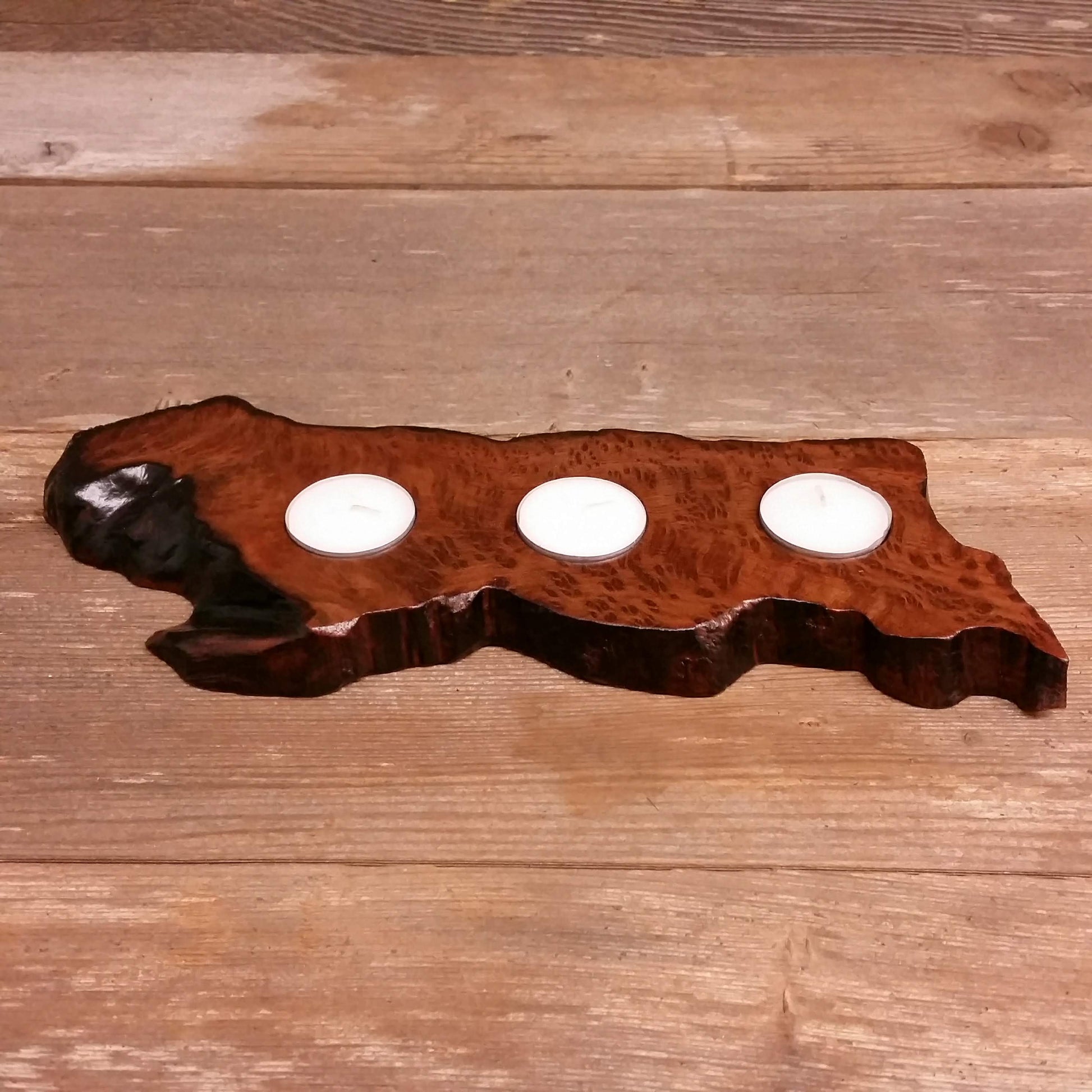 Wood Candle Holder that holds 3 Tealight Candles and is made out of Redwood Burl. Great for sitting on a mantle, shelf, table, coffee table, etc.