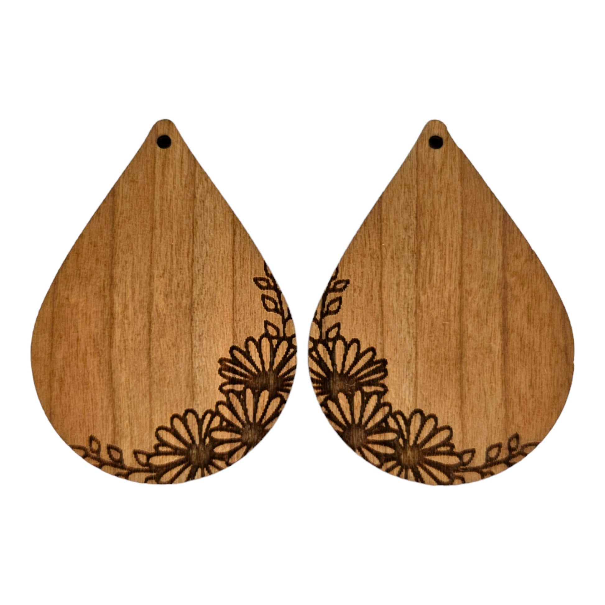 Wood earrings in a teardrop shape engraved with a group of small daisies on the edge handcrafted in the USA in a small father and daughter wood shop in Northern California.